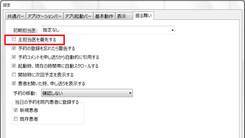 設定すると、初期担当医(アポイント)と主担当医(患者原簿)に違う医師名が登録されている場合、主担当医(患者原簿)を優先してアポイント登録時の担当医師に登録します。