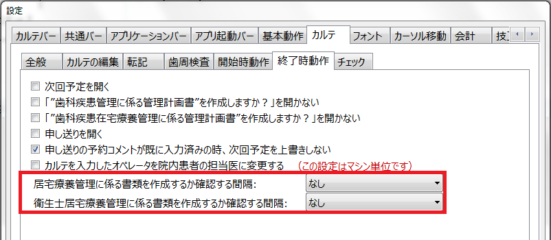 10. 設定>カルテ>終了時動作に、「居宅療養管理に係る書類を作成するか確認する間隔」「衛生士居宅療養管理に係る書類を作成するか確認する間隔」を新規作成しました。終了時に書類を作成するか尋ねるポップアップの、表示間隔を設定することができます。